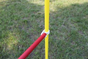 - Beim Aufbau der Hürden, werden die Abwurfstangen durch die Halterungen, sicher gehalten und können trotzdem, bei einer Berührung durch den Hund, herunterfallen