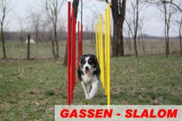 • Zum Üben mit Anfängerhunden ist es empfehlenswert, einen Gassenslalom zu stecken und damit eine Gewöhnung an die Stangen zu fördern.