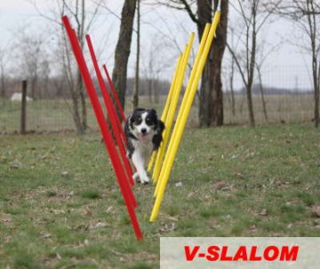 • Mit dem Stecken eines V-Slaloms erreicht man schon fast die eigentliche Form des Slaloms, jedoch ohne das der Hund die Stangen berühren muss.