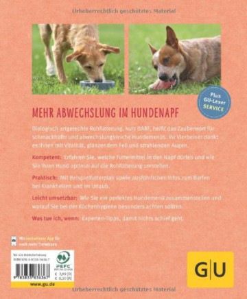 Ratgeber von Marianne Kohtz-Walkemeyer “ BARF für Hunde “ . Den besten Freund gesund ernähren erschienen im GU Verlag. Auf 64 farbigen und reich bebilderten Seiten erfahren Sie, wie man Hunde biologisch artgerecht ernähren kann, wie man abwechslungsreiche Hundemenüs zubereitet und dabei die Vitalität des Hundes fördert und welche Futtermittel verwendet werden dürfen, wenn Sie Ihren Rund auf Rohfütterung umstellen möchten – wie ein Beispielfutterplan aussehen kann Die Autorin ist Hundezüchterin und geprüfte Tierheilpraktikerin.