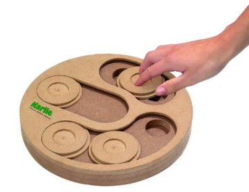 - Auch für größere Hunde geeignet, weil die Teile gut mit der Schnauze oder der Pfote zu fassen sind. Nachtei ist die Faserplatte, da sie durch das sabbern schnell aufweicht.
