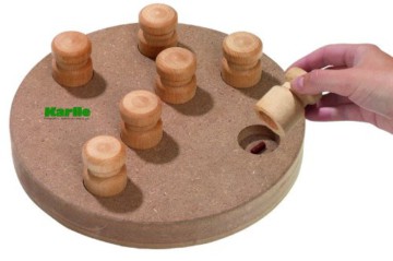 Der Doggy Brain Train ist 2seitig und hat einen Durchmesser von 32cm. Es ist ein Brettspielzeug aus weichem Holz. Die Motivation ihres Hundes erfolgt durch Leckerchen.