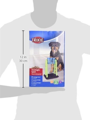 Das Geschicklichkeitsspiel Turn Around besteht aus drei Behältern, die mit Leckerlies befüllt werden. Um diese zu erlangen, muß der Hund die an der Stange aufgehängten Behälter drehen, so daß die Leckerlies herausfallen. Mit etwas Geschicklichkeit kommt der Hund so an die Belohnung.